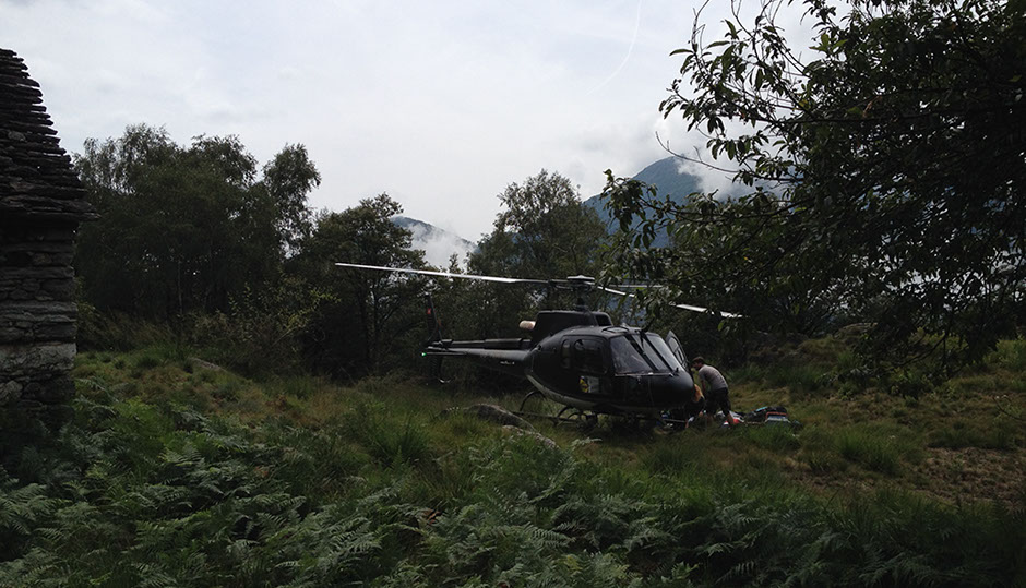 Equipment Transport per Helikopter für die Dreharbeiten im Tessin
